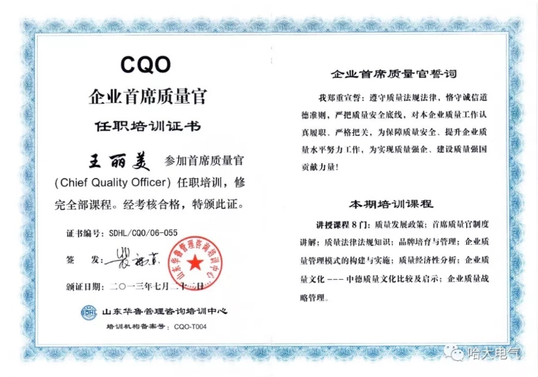 近幾年,哈大電氣一直將“質(zhì)量”放在公司的戰(zhàn)略高度上,上圖為公司品管部部長(zhǎng)經(jīng)過(guò)培訓(xùn)后獲得了“企業(yè)**質(zhì)量官”的資質(zhì)證書(shū)。